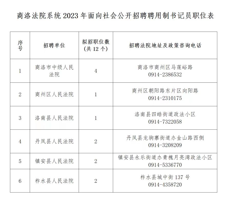 全市法院共招聘聘用制書記員12名,各法院招聘職位、地址及政策咨詢電話詳見(jiàn)《商洛法院系統(tǒng)2023年面向社會(huì)公開(kāi)招聘聘用制書記員職位表》(附件)。
